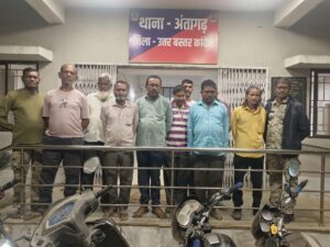 — थाना अंतागढ पुलिस ने जुआड़ियो के उपर की कार्यवाही। जुआ एक्ट के मामले में 09 आरोपी गिरफ्तार। पुलिस जानकारी के अअनुसार घटना का संक्षिप्त विवरण इस प्रकार है कि गत 09.02.2026 को मुखबीर के माध्यम से देवनीडोकरी मंदिर अंतागढ़ के किनारे खुली आम जगह में कुछ व्यक्ति ताश के 52 पत्ती से रूपये पैसे का हार जीत का दांव लगाकर जुआ खेलने के संबंध में सूचना मिलने पर वरिष्ठ अधिकारियों के आदेशानुसार थाना प्रभारी अंतागढ़ के नेतृत्व में टीम गठित कर मुखबीर सूचना तस्दीक हेतु रवाना हुए थे, जो मुखबीर के बताये स्थान पर पहुंचकर, घेराबंदी कर जुआ रेड़ की कार्यवाही किया गया। जुआ रेड कार्यवाही के दौरान 1.अरविंद आंतरम 2.फिराजे खान 3.खलील अहमद 4.मेघ बहादुर 5.मिस्त्री लाल गुप्ता 6.मृणाल कर्मकार 7.रमेश माली 8.जोहरू मण्डावी 9. जहांगीर खान सभी निवासी अंतागढ़, थाना अंतागढ़, जिला कांकेर के द्वारा ताश के 52 पत्ती से रूपये पैसे का दाव लगाकर जुआ खेलना पाया गया। जिनके कब्जे से कुल जुमला राशि 5190/- रूपये, ताश के 52 पत्ते, सफेद रंग के प्लास्टिक बोरी एवं घटना स्थल से जुआड़ियो का 06 नग मोटर सायकल एवं 07 नग एंड्राइड मोबाईल जप्त कर आरोपियो के विरूद्ध छत्तीसगढ़ जुआ (प्रतिषेध) अधिनियम की धारा- 3(2) के तहत अपराध पंजीबद्ध कर आरोपियाें को गिरफ्तार कर वैधानिक कार्यवाही की गई। पुलिस टीम में निरीक्षक रमेश जायसवाल थाना प्रभारी अंतागढ़, उनि0 आलोक सुबोध, प्रधान आरक्षक अजेन्द्र नरेटी, नरेश मांझी, रोशन नेताम,आरक्षक दिलीप कोरेटी, रंजीत ठाकुर, महेश यादव, जितेन्द्र नेताम, डीएसएफ आरक्षक शंभु उसेण्डी। रहे।
