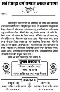 10.सर्व पिछडा वर्ग समाज ब्लाक चारामा के अध्यक्ष एवं अन्य पदाधिकारियों का निर्वाचन साहू सदन जैसाकर्रा चारामा में।