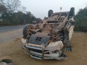 —जिले में सडक हादसे रूकने का नाम नहीं ले रहे है। आज अपरान्ह राष्ट्रीय राजमार्ग 30 लखनपुरी पेट्रोल पम्प के सामने बडा हादसा होने से बचा। अगर सामने से कोई वाहन आ रहा होता तो हादसे गंभीर हो सकता था। बताते चलें रायगढ से किसी अधिकारी को लेने केशकाल जा रही वाहन क्रमांक सीजी 14 एमई 7184 जैसे ही पेट्रोल पम्प के पास पहूंचा था,कि सामने का एक टायर फट गया। टायर फटते ही चक्का ही बाहर निकल गया। प्रत्यक्षदर्शियों ने बताया कि यह दो तीन पलटी खाई और अंत में उल्टा पलट गई। लेकिन इस वाहन मे चालक राजकुमार पटेल ने बताया कि अन्य दो में किसी को गंभीर चोट नहीं आई है। इसे लेकर आज यहां चर्चा का विषय बना रहा और लोगों ने कहा-जाको राखे साईंया मार सके ना कोय।