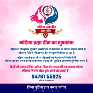 आज 01 फरवरी को पुलिस अधीक्षक निखिल अशोक राखेचा (भापुसे) के निर्देशानुसार, आकाश श्रीश्रीमाल (भापुसे) ASP भानुप्रतापपुर, दिनेश कुमार सिन्हा ASP कांकेर के मार्गदर्शन में सुश्री प्रतिभा लहरे, DSP (बाल विरूद्ध अपराध अन्वेषण), सुश्री विंकेश्वरी पिंदे DSP (मुख्यालय) की उपस्थिति में महिलाओं की सुरक्षा, सुगमता, सम्मान एवं सशक्तिकरण को अधिक प्रभावी बनाने के उद्देश्य से जिले में “महिला रक्षा टीम” का शुभांरभ किया गया । कांकेर पुलिस का अभिनव पहल का उद्देश्य महिलाओं की सुरक्षा, उनके विरुद्ध घटित अपराधों की रोकथाम, उन्हें त्वरित सहायता प्रदान करना और सुरक्षित वातावरण सुनिश्चित कराना है।