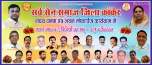 —आज सेन समाज जिला कांकेर भवन का लोकार्पण एवं शपथ ग्रहण समारोह गरिमामयी सभा के रूप में सम्पन्न हुआ। जिसमें सेन समाज के प्रदेश स्तरीय पदाधिकारियों सहित जिला सेन समाज से काफी संख्या में समाजवासी उपस्थित हुएं। मुख्य अतिथि के रूप में कांकेर विधानसभा के विधायक आशा राम नेताम शामिल हुए।