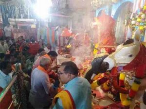 चित्र—अंगारमोती मंदिर में आस्था की ज्योति प्रज्जवलित किये जाने पूर्व पूजा करते भक्तजन।