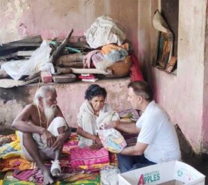 चित्र—खंडहर में अपना जीवन व्यतीत कर रहे गरीब दंपत्ति को सहारा देते जनसहयोग के अध्यक्ष अजय पप्पू मोटवानी ।
